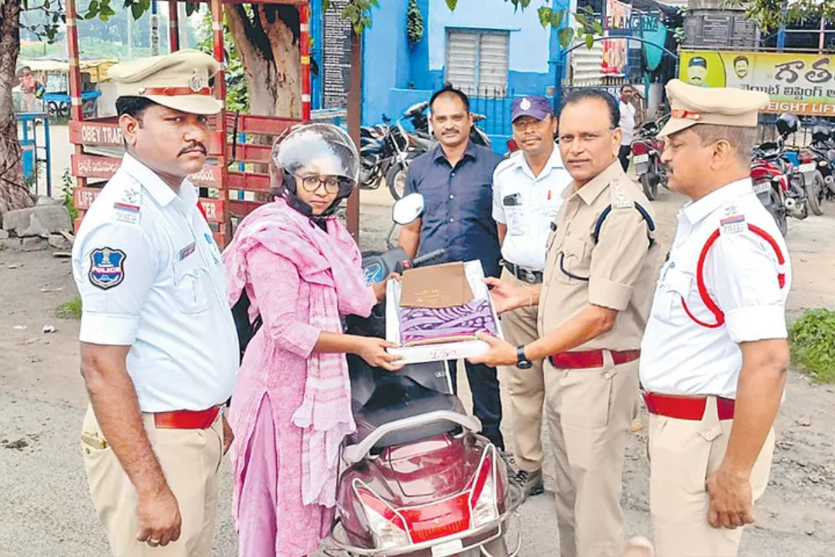 Hyderabad : ట్రాఫిక్ నిబంధనలు ఉల్లంఘించిన వారికి జరిమానాలు విధించడమే కాదు… ఆ నిబంధనలు పాటించే వారిని గౌరవిస్తామని తెలంగాణా (Telangana) ట్రాఫిక్ పోలీసులు నిరూపించారు. ఈ నేపథ్యంలో నిబంధనలు పాటించిన మహిళా బైక్రైడర్లకు ట్రాఫిక్ పోలీసులు శ్రావణం చీర కానుక ప్రకటించారు. ట్రాఫిక్ నిబంధనలు పాటిస్తూ హెల్మెట్ ధరించిన మహిళలకు చీర, జాకెట్ అందజేశారు. పెద్దపల్లి జిల్లా గోదావరిఖని మున్సిపల్ ఆఫీస్ చౌరస్తా వద్ద గురువారం పోలీసులు ప్రత్యేక తనిఖీ చేపట్టారు. హెల్మెట్ ధరించి.. నిబంధనలకు అనుగుణంగా బైక్ డ్రైవ్ చేస్తున్న మహిళలను గుర్తించి చీరలు అందజేసి సత్కరించారు.