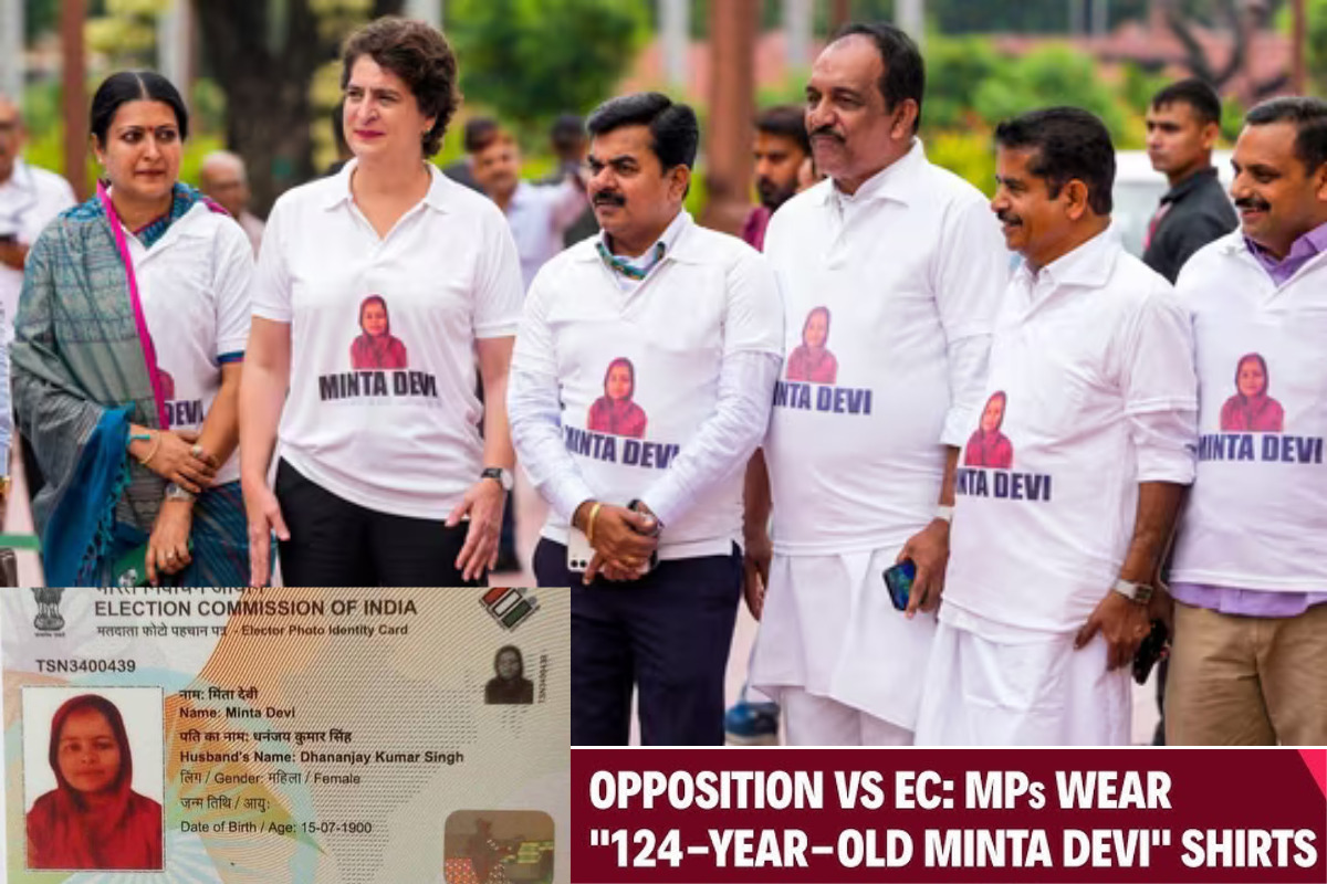 Minta Devi 124: బిహార్‌ ఓటరు జాబితా ప్రత్యేక సమగ్ర సవరణను (ఎస్‌ఐఆర్‌) వ్యతిరేకిస్తున్న కాంగ్రెస్‌, ఆర్జేడీ వంటి విపక్ష పార్టీలు సోమవారం దిల్లీలో నిరసన ర్యాలీ చేపట్టిన విషయం తెలిసిందే. మంగళవారం కూడా విపక్షాలు తమ నిరసనను కొనసాగించాయి. ఆందోళనల్లో భాగంగా కాంగ్రెస్‌ ఎంపీ ప్రియాంక గాంధీతో సహా పలువురు ప్రతిపక్ష నేతలు ‘మింతా దేవి’ అనే బిహార్‌ ఓటరు ఫొటోతో ఉన్న టీ షర్టులు ధరించి పార్లమెంటు వెలుపల నిరసనలో పాల్గొన్నారు. కాంగ్రెస్‌ జాతీయాధ్యక్షుడు మల్లికార్జున ఖర్గే, సోనియా గాంధీ, ఇతర ప్రతిపక్ష ఎంపీలు ఈ కార్యక్రమానికి హాజరయ్యారు. బీహార్ కు చెందిన 124 ఏళ్ల వృద్ధ మహిళ మింతా దేవి (Minta Devi 124) పేరు ఓటరు జాబితాలో కనిపించడంతో… ఇండియా కూటమి నేతలు మింతా దేవి ఫొటో ఉన్న టీ షర్టులు, వాటిపై 124 నాటౌట్ అని రాసి ఉన్న వాటిని ధరించి నిరసనలో పాల్గొన్నారు.
