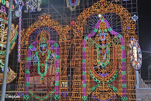 తిరుపతి : శ్రీనివాస మంగాపురం శ్రీ కల్యాణ వేంకటేశ్వర స్వామి వారి వార్షిక బ్రహ్మోత్సవాల్లో భాగంగా టీటీడీ చేపట్టిన విద్యుత్ కాంతులు, పుష్పాలంకరణలు భక్తులను విశేషంగా ఆకట్టుకుంటున్నాయి. శ్రీనివాస మంగాపురం పరిసర ప్రాంతాలు, జాతీయ రహదారులు, ప్రధాన కూడళ్లలో ఏర్పాటు చేసిన విద్యుత్ అలంకరణలు భక్తులను మంత్ర ముగ్ధులను చేస్తున్నాయి. ఇవి బ్రహ్మోత్సవాల వైభవాన్ని కొత్త ఎత్తులకు తీసుకెళ్తూ పండుగ వాతావరణాన్ని మరింత ఉత్సవంగా మారుస్తున్నాయి. బ్రహ్మోత్సవాల్లో భాగంగా చిన్న, మధ్య, పెద్ద పరిమాణాల్లో సుమారు 75కు పైగా అద్భుతమైన ఇల్యూమినేషన్ బోర్డులు ఏర్పాటు చేశారు. నాలుగు మాడ వీధులలో గరుత్మంతుడిపై మహావిష్ణువు, లక్ష్మీదేవి, ఆభరణాల వేంకటేశ్వర స్వామి, వినాయకుడు, లక్ష్మీ, గజ వాహనం, ఆదిశేషుడిపై మహావిష్ణువు, దశావతారాలు, అష్టలక్ష్మీ తదితర రూపాల్లో ఏర్పాటు చేసిన విద్యుత్ అలంకరణలు ప్రత్యేక ఆకర్షణగా నిలుస్తున్నాయి.