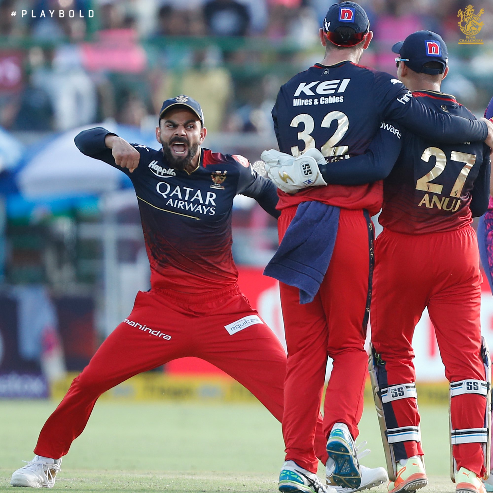 వేన్ పార్నెల్ తన అద్బుతమైన బౌలింగ్ తో ప్రత్యర్థి జట్టు ఆటగాళ్లకు చుక్కలు చూపించాడు. కేవలం 3 ఓవర్లు వేసి 10 రన్స్ ఇచ్చి 3 వికెట్లు తీశాడు. ఇదిలా ఉండగా ఆర్సీబీ బౌలర్ బంతిని సిక్స్ కొడదామని శాంసన్ యత్నించాడు. కానీ అది అమాంతం గాల్లోకి ఎగిరింది. వికెట్ కీపర్ అనూజ్ రావత్ అద్భుతంగా క్యాచ్ పట్టుకోవడంతో 4 పరుగులు చేసిన శాంసన్ వెనుదిరిగాడు. దీంతో మైదానంలో విరాట్ కోహ్లీ ఎంజాయ్ చేశాడు. ఇందుకు సంబంధించిన ఫోటోలు, వీడియోలు వైరల్ గా మారాయి.